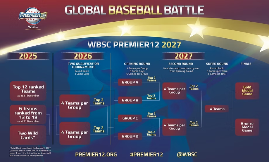El nuevo formato, presentado en octubre de 2024, establece que “los 12 mejores equipos del Ranking Mundial de Béisbol Masculino de la WBSC al final de 2025 se clasificarán directamente para la Fase de Grupos de 2027, mientras que los equipos clasificados entre el puesto 13 y el 18, junto con dos equipos invitados (Wild Cards), disputarán los Torneos de Clasificación del Premier12 para definir a los otros cuatro participantes en la Fase de Grupos”.